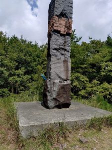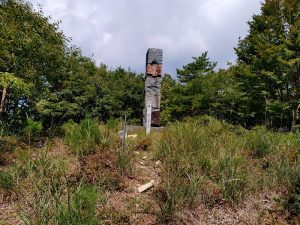 周囲は樹林に囲まれて展望は無く有りませんが「平成之大馬鹿門」の彫刻が異彩を放っています。此の彫刻は京都の仏教大学の門柱として制作されましたが、その彫りこまれた名称に問題ありとする大学側と、否定する作者との意見の違い、つまり大馬鹿門が仏教の教えに添わないとする大学側と、作者の空充秋(そら みつあき)氏との間で議論が交わされましたが、折り合いつかず大学側はこれを拒否。その後、全国から多くの譲渡申し入れが殺到、結果として千種町が譲り受け、21世紀へのシンボルとして、千種川を挟んだ 空山とおごしき山の二つの山に設置されたとの事。機会が有ればもう一方が立つおごしき山に登って見たいものです。以前はおごしき山から空山の彫刻が見えたとの事ですが、現在は見えない様です。