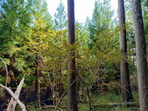 初めは九十九折の道ですがP680.7への最後の登りでは9年前は巻き上がったのですがその道は見つからず直登の急坂を登ります。P680.7からは最低鞍部迄檜林の下り気味の尾根で、西側から重機、チェーンソ-の音が聞こえて来ます。どうやら新しい林道を造っているようです。最低鞍部からは掘割状の道も現れて来ますが、展望が殆ど無い檜林の登り切ると空山の山頂。