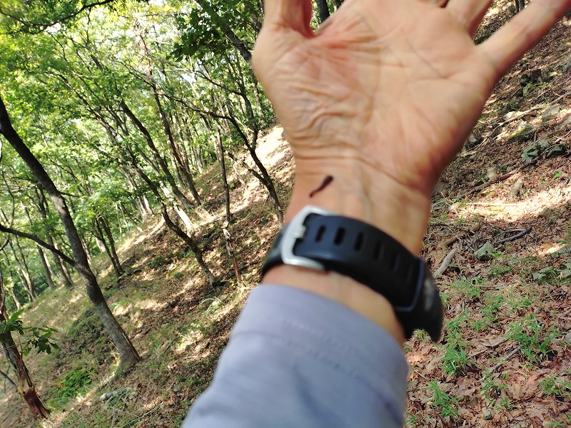 9年前はこの山椒をメンバ-全員で坊主になる程摘んで下山したので、今年の6月に山椒を目論んで計画したのですが雨天で中止し、今日になった曰く付きの山ですが、山椒が見られただけで良しとしましょう。下山直前の蛭生息場所では注意したにも関わらず靴の中に入り込み靴下に頭を突っ込んでいた蛭を発見。帰りは汗を流しに、エーガイアちぐさに向かいます。お疲れ様。