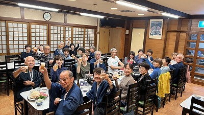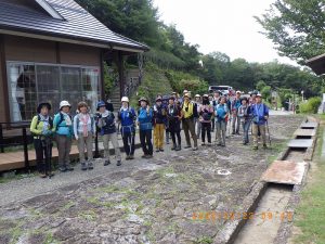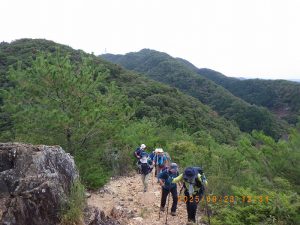 余りのんびりと出来ないので、此処で昼食後直ぐに出発します。一旦多賀坂峠まで下って薬師前岳へ登り返しますが、昼食でお腹が膨れているので登り返しは結構堪えます。此処からは各務野自然遺産の森に向けて樹林帯の道を下るだけです。下山した各務野自然遺産の森では、未だ暑い中、秋分の日で家族連れ、グル-プがタープ等を張って、思い思いに過ごしています。約束の時間にバスに乗り今日の宿舎に向かいます。