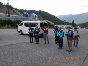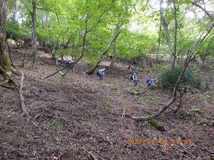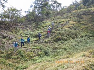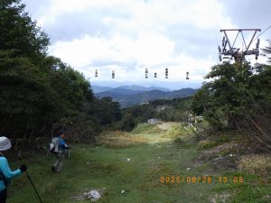 2年ぶりに滋賀一周トレイル(奥伊吹区間)を再開します。今日奥伊吹スキー場ではフォーミュラ-ジムカ-ナ学生大会が開催されていて駐車場はほぼ満車で大勢の人々で賑わっています。我々はスキー場の駐車場に駐車させて頂き、長靴で出発しますがセンタ-ハウスの前を通り法面の踏み跡を登り初め、ネットに沿ってススキをかき分けながらコルまで登り、大長谷への踏み跡を探しますが見つからないので尾根を探しながら登り小ピーク手前で登り過ぎた事に気付き浅い沢を大長谷に下り、渡渉してブンゲン北西尾根末端からの急登を登り始めます。