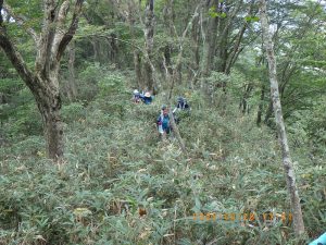 踏み跡はしっかりしておりCo1000m付近からブナが現われて来ますが、尾根の下生えは2年前と比べて濃くなったような気がします。Co1100m付近から現れて来る笹が登るにつれて濃くなり、最後は胸辺りまでになりますが、踏み跡がしっかりしていますので笹をかき分けて登り稜線の登山道と合流します。笹薮は山頂直下の方が酷く潜り込むようにかき分けながら登り着いたブンゲン山頂は2年前と同様にガスに覆われて展望は有りませんが風は遮られて比較的暖かいので此処で昼食にします。
