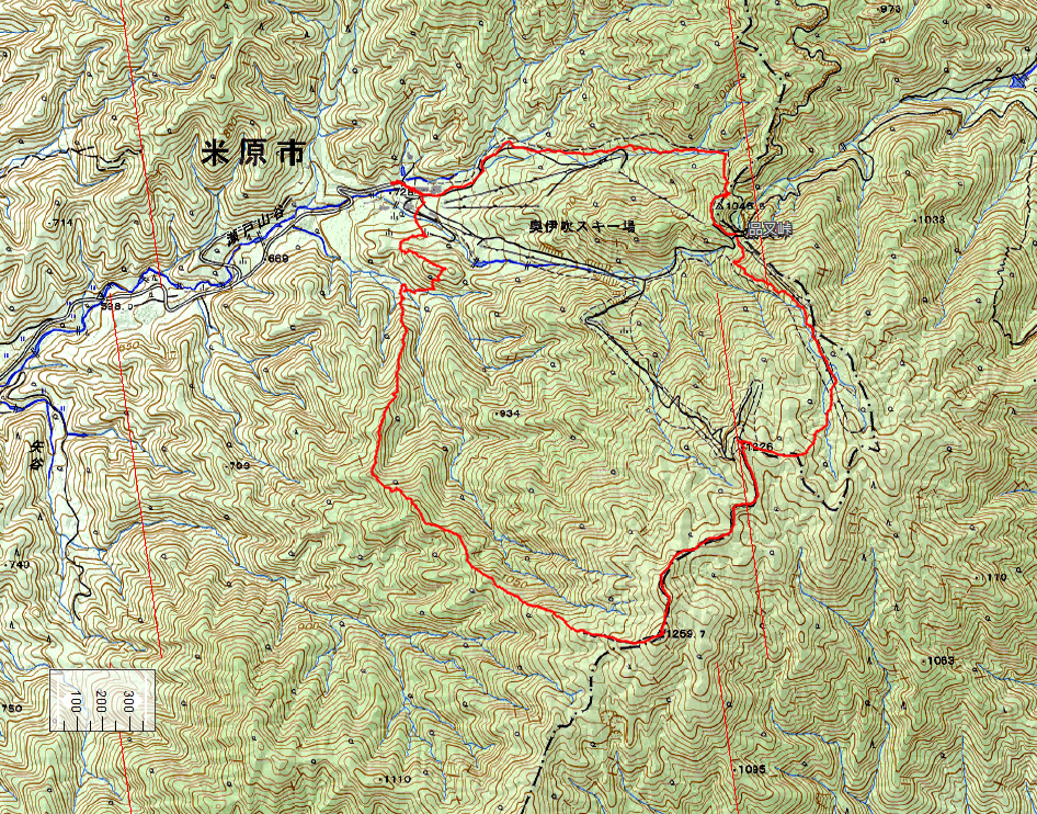 奥伊吹スキ-場(8:50~8:57) →ブンゲン北西尾根末端(9:39~9:43)→ブンゲン (11:35~12:10) →最高点リフト降り場・P1226 (12:36~12:47)→品又峠(13:26~13:37) →奥伊吹スキ-場(14:06)
