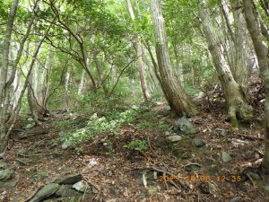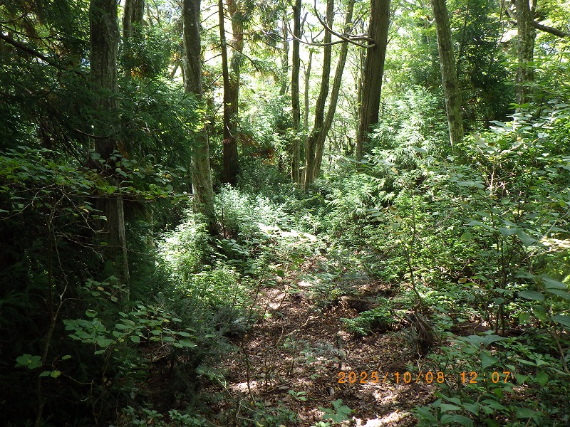 下山路のヤブ 降りて来た急斜面を振り返る
