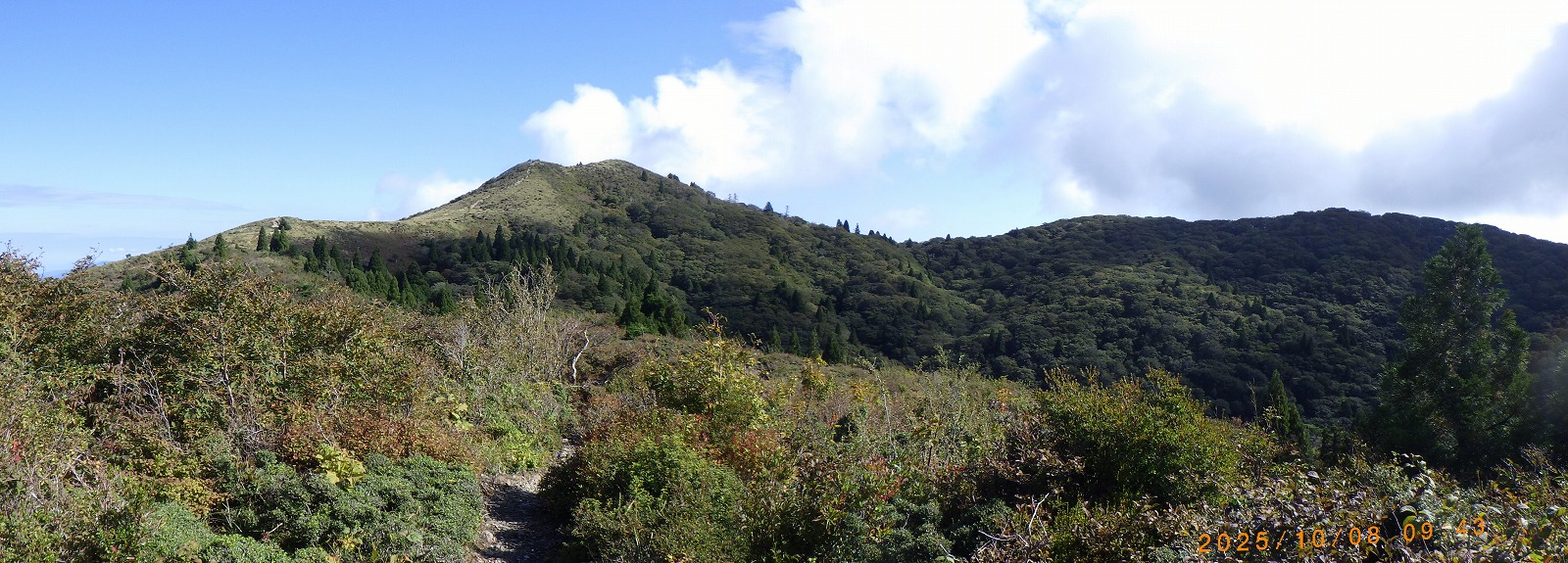 所々雲が湧いていますが、南に見える蓬莱山では例会ですが、今頃は中腹当りを登っている時間です。風も緩やかで穏やかな日差しの中、少し早いですが昼食にします。シャクシコバノ頭からの下山路は南に下る小川新道ではなく、南西方向に派生した支尾根(南西尾根)を下りますが、以前無雪期に登った時より灌木のヤブが酷くなったような気がする上に、かなりの急坂で膝が痛くなりペースがガタ落ちて予想より大幅に時間が掛かってしまい、林道に着地した時にはホッとします。