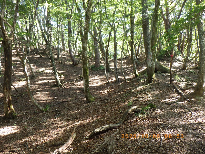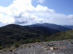 紅葉はまだまだですが地面には柴栗、ドングリがまとまって落ちています。比良山系北部はこれらが不作で熊が餌を求めて南部に移動しているとの事で、時々大声を出しながら登ります。途中で2人パーティ-を追い越しますが、駐車場に止まって居た車の方でしょうか。