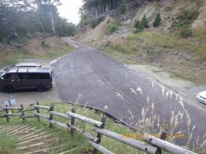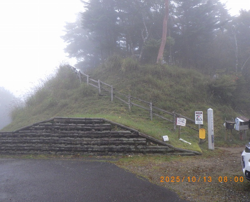早朝から登山口に向けて車を走らせますが、昨夜の天気予報では殆どの予報会社に拠ると本日は晴天の予報でしたが、登山口に近づくにつれて雲が厚くなり登山口の太尾駐車場に着く頃は周囲はガスに覆われて、朝8時に関わらず夕方の様な暗さで準備をしていると雨も降り出して来ます。朝一時的に小雨との予報の予報会社が有ったので、午前中には晴れるだろうと希望的観測でカッパだけ着て出発します。