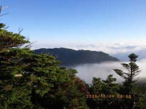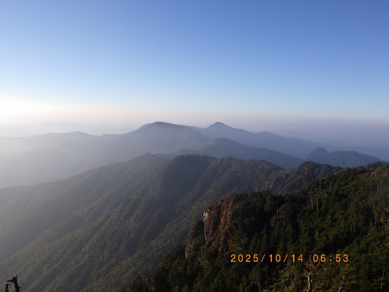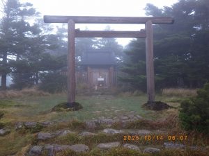 起床後外に出ると上空には星が輝いているのでホッとします。朝食は6時からとの事ですが朝食をおにぎりにしてもらい日の出と共に昨日行けなかった弥山神社に向かい、本日の無事を祈願後帰路に付きます。八経ヶ岳山頂は上空には青空が広がっていますが薄っすらとしたガスが残って遠方は少しぼんやりとしていますが、昨日の雨にも関わらず来て良かったと感謝しながら大きなおにぎりを頂きます。