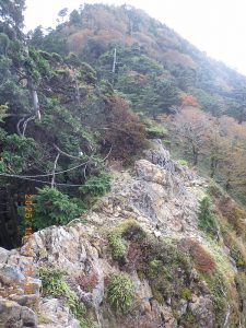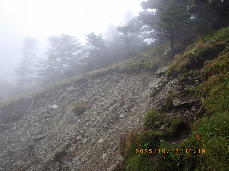 五鈷峰付近の崩壊地に差し掛かると再び雨も降り出し天候も悪化しますが崩壊地付近は注意して歩けば問題になるような所は有りません。此処を登り切ると明星ケ岳ですが、山頂に寄るのは明日にしてパスし八経ヶ岳に向かいます。