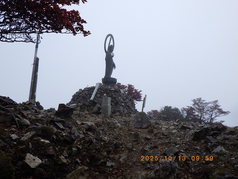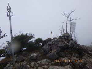 戻って来た釈迦ケ岳山頂は昨日程では有りませんが、ガスに覆われてしまいます。時々ガスが薄くなって、奥駆道南部の稜線が見える時が有るので写真に収めながら遅い昼食を摂っている間に単独行の方が一人で登って来られます。
