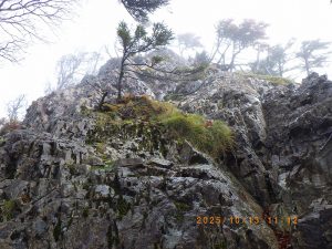 釈迦ケ岳までの岩峰の通過は岩は乾いていて滑る事は気にしなくて良いのですが岩峰間の笹に覆われたトラバ-ス部は道が笹に覆われて見えにくいので濡れた木の根に乗らない様に昨日と同じように慎重に登り返します。