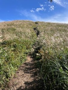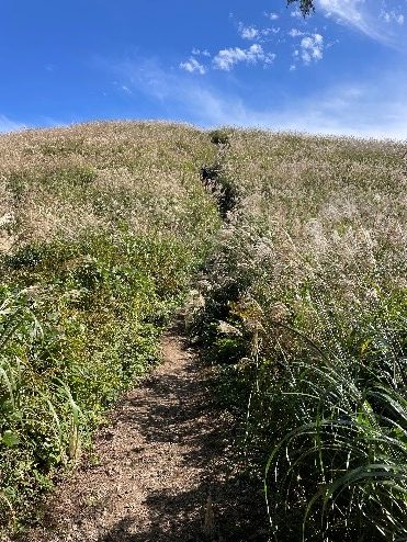 以前、初めて岩湧山を訪れた際、どれくらい歩いただろうか、静かで美しく少し暗い杉林が突然終わると、明るく開けた目の前の斜面一面がススキに覆われ、その先に細く登山道が青空まで続いていた。その印象が頭から離れず、今回の例会とした。