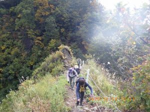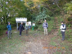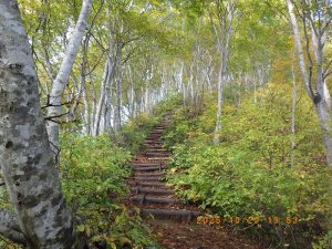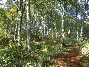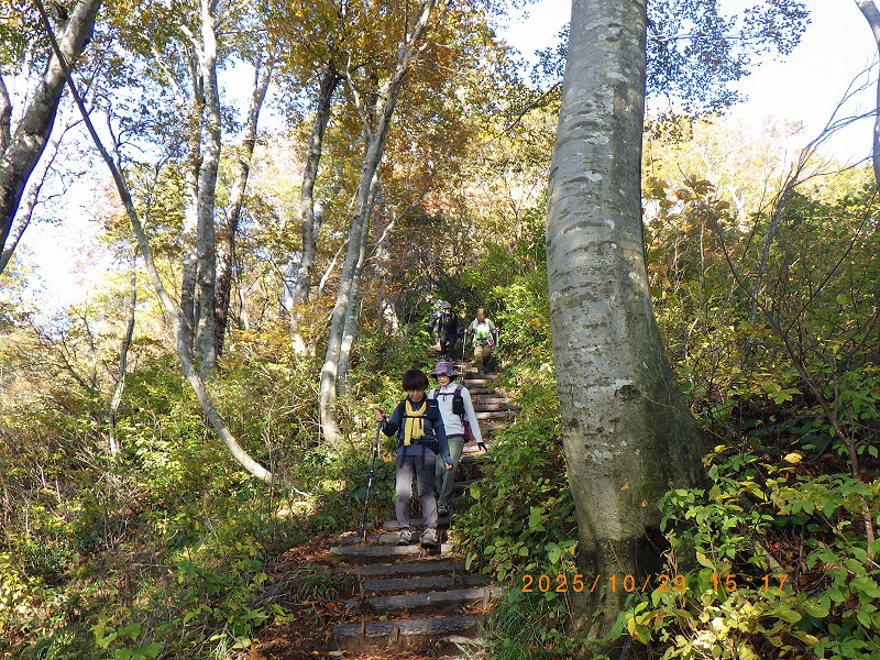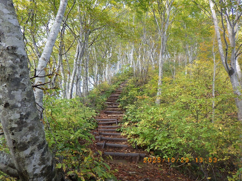 紅葉は始まったばかりの様でこの辺りも夏の猛暑の影響が出ているのでしょうか。ブナ林の中の急な階段を登ると下牧への分岐に登り着き、一息入れている間に単独の方が降りて来られます。分岐から一旦下って雨水に浸食された登山道を登り切ると米山の山頂です。