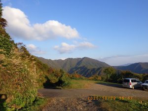 避難小屋の中の気温は6℃ですが、外でも風は穏やかで陽が射しているので余り寒さは感じ無いのでのんびりと休憩の後下山に掛かりますが、荷物が軽いので急坂もすんなりと下降して駐車場まで下山し、今日の宿舎に向かいます。