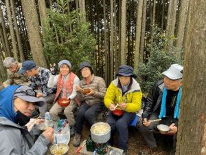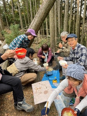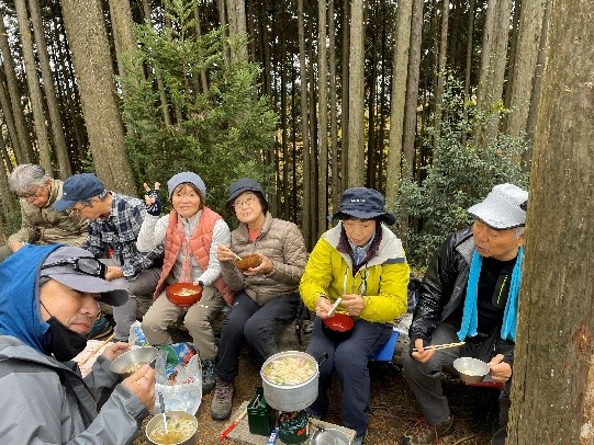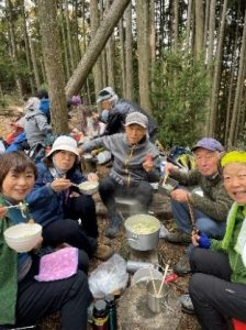 山頂で4つのグループに分かれ、それぞれポットの湯、粉末出汁、鶏モモ肉、野菜、うどんを投入。出来上がりに皆が集中。それぞれの進捗状況を確認したりして、これがまた楽しい。出来たグループから食べ始める。鶏の出汁が出てお腹から温まってとても美味しい。途中小雨がぱらついてきたが気にも留めず最後まで食べ尽くした。