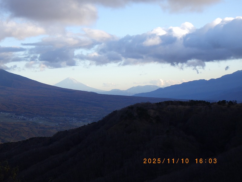 左下から右上への道を登ります 八ヶ岳は雲の中、富士山(右奥)は見えています