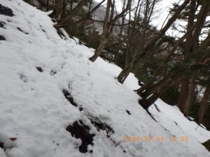 急斜面、滑るのでスノ-シュ-外してツボ足で 雪が少ないので滑る!!、滑る!!