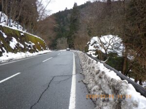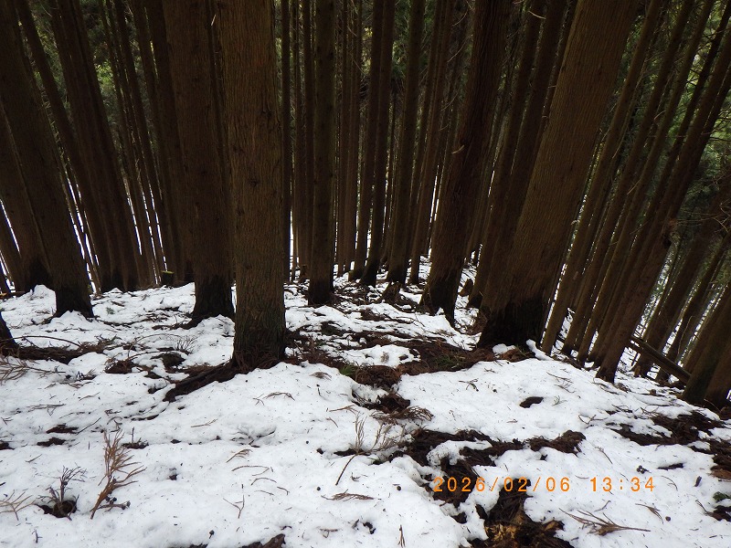 昼食後のニゴ谷右岸尾根は9年ぶりですが、9年前の記録を読み返すと今回よりは積雪は多いようで、前日の下見のトレ-スが有り随分楽をしたようですが、今回は前回と比べて随分雪は少なくCo790m付近でスノ-シュ-を脱いでツボ足で下りますが、杉林に入ってからの急斜面は雪が少なく滑り易くてペースを落として慎重に下り国道に降りて来た時はホッとします。これで宿題が一つ片付きました。