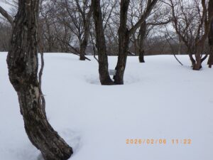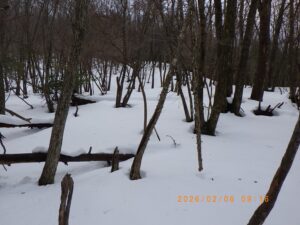 尾根が北東方向に直角に折れ曲がる辺りまで登るとようやくなだらかになり雪も増えて15cm程のラッセルが森山岳山頂まで続きます。登り着いた森山岳山頂にはトレ-スは全く無く今週は誰も登っていない様です。