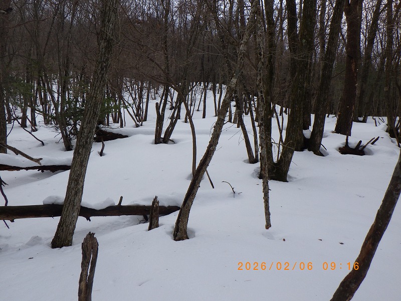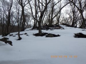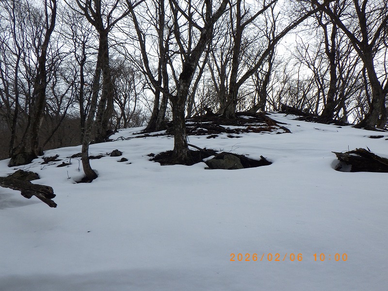 此処もかなり急斜面のザレ場をずり落ちながら尾根に登り着きます。雪は少なくステップが作れない急斜面を登り着付けますが、徐々に雪が増えて来たのでCo690m付近でスノ-シュ-を履き、踝くらいまでのラッセルで緩やかな尾根を登り続けます。Co790m付近から再び雪が吹き飛ばされて所々地面が露出した急登が始まり、雪が少なくてラッセルが無いのは有難いのですがそれでもかなり堪えます。
