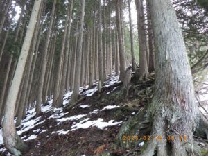 杉林の急斜面を登ります 雪が増えてスノ-シュ-履きます