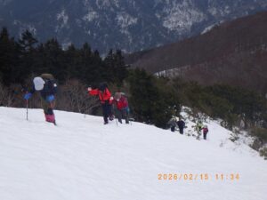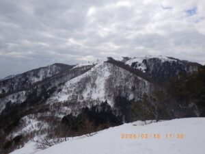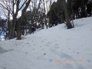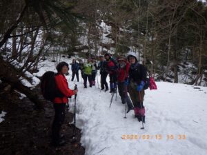 今回の岩籠山例会は当初のISさんからリ-ダ-を引き継ぎました。当初の計画では昨年と同様インディアン平原から北東に派生する尾根を新疋田駅から登る積雪期のル-トでした。このルートはCo390m付近に崖状の斜面が有り、昨年は何とかクリア-しましたが雪の状態により、特に下山する場合は下降出来ない可能性が有り、又、昨年はメンバ-は6名でしたが今回は11名と2倍のメンバ-になり、各人の体力・技術にばらつきが有るので行動時間が延びる可能性が有ります。