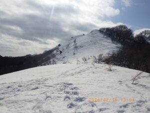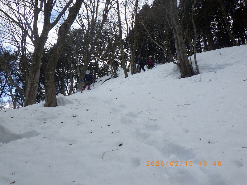積雪は30~40cm程ですが週末前からの異常に暖かい天気ですっかり腐った雪は重くて15cm以上沈み込み先行きが心配です。途中誤ってヤブに突入し、暫くもがきましたが、その後は自然林・檜林の尾根を登り、P629.4直下の急登を交替でラッセルしながらピークに登り着きます。