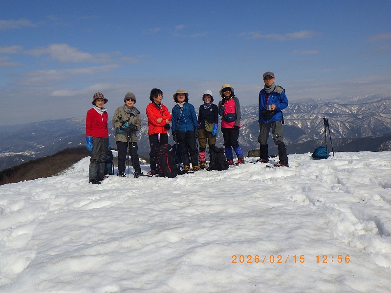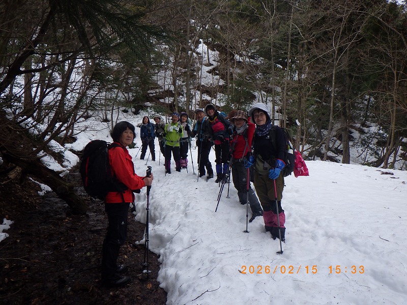 昨年の締まった雪は何処に行ったのか、ぐずぐずの腐った雪で急坂を沈み込みながらなんとか登り切りますが、IHさんもここまでとの事で待ってもらいます。この状態ではインディアン平原迄足を延ばした場合、下山時にもかなり時間が掛かる可能性が有り電車の時間が気になりますので、目標をインディアン平原手前のCo690m台地までと決めて、台地に登り着いた時にメンバ-に伝えます。暖かな陽射しの下で昼食後早々に下山に掛かり、途中で待ってもらっていた4名のメンバ-と合流してほぼ予想した時間内に新疋田駅に到着します。お疲れ様でし