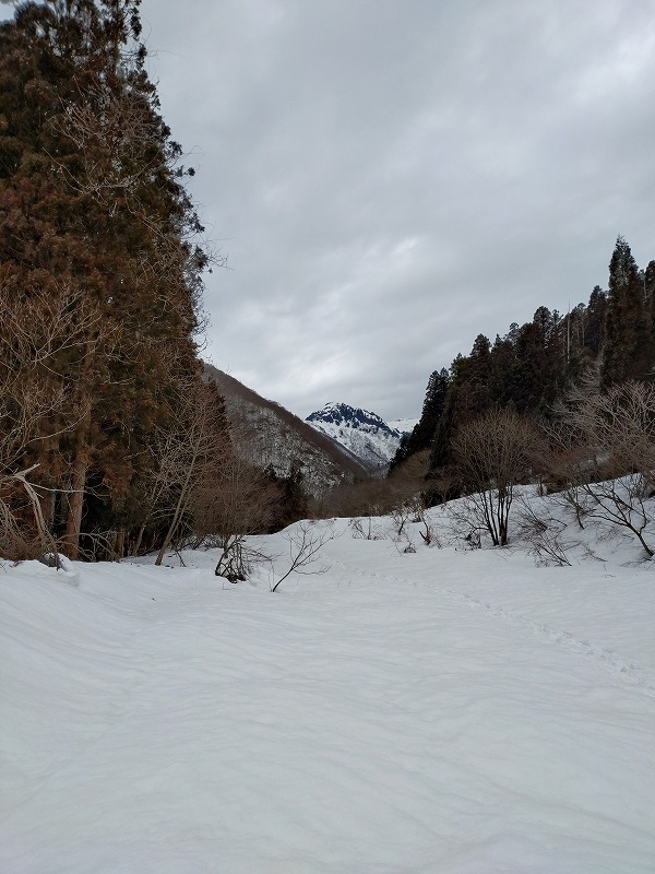 15年ぶりの若丸山です。当時は国道417号が塚白椿隧道迄しか開通していなかった上に、塚白椿隧道までは通行止めで4月にならないと行けませんでしたので現在の様に2月に若丸山に登の事は考えられませんでした。塚白椿隧道を出た所の駐車場には先行者の方の車が1台止まって居ます。今日は午後から天気が崩れるとの予報で天気が崩れる前に山頂に立つつもりですが、既に曇り空で予想より早く崩れそうな中、出発します。