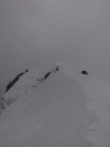 中央の壁状の尾根を登ります 猛吹雪の山頂への登り
