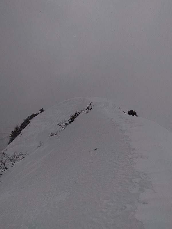 最後の壁の登りもステップがしっかりしているので随分楽ですが、途中下山してこられる女性の単独行の方とすれ違います。てっきり駐車場の先行車の方と思ったのですが、翌日若丸山の記録を読んでいると、先行車の方は冠山方向に縦走した様ですが、記録の中で稜線上においてこの単独行の方(冠山を登った後若丸山経由で下山)とすれ違ったとの事です。私なぞ想像出来ない様な体力です。最後の壁を登り吹雪で体を持っていかれそうな猛烈な風が吹いている中、やっと若丸山の山頂に到着。