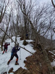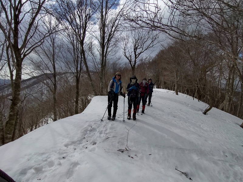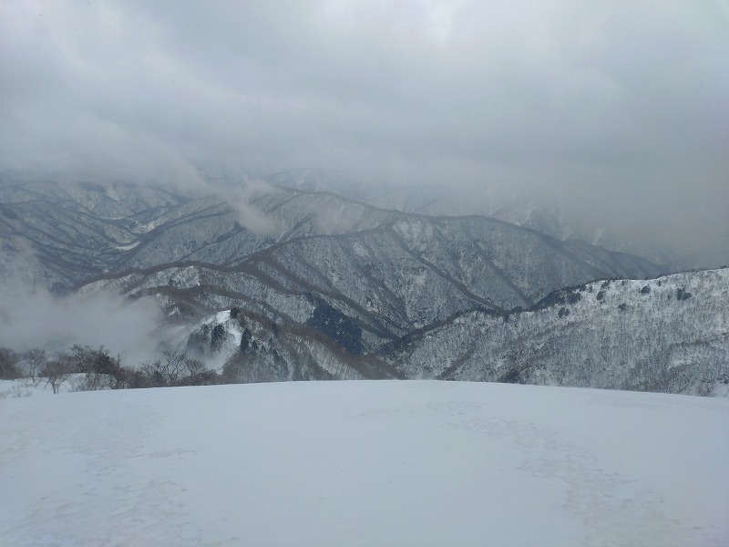 此処からの雪が落ちた細尾根の激下りは樹に掴まりながら下降すると再び穏やかなブナ林の尾根が続いています。昼前にP916に到着する頃は全天雲に覆われて曇り空になります。まだ明るい曇りで遠くの山並みもはっきり見えるのでこれ以上天気が悪化しない様に願いながらP1072への急登に掛かりますが、登り切る頃には急激に悪化して風と共に霰が打ち付けて来ます。