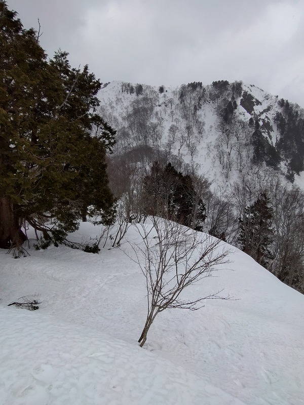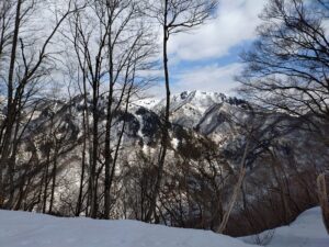 雪は締まっていますが登り口でワカンを履きます。トレースを辿って杉林の急登を登り始めますが杉林のトレースも堅いのでアイゼンに履き替え、急坂を尾根迄登り着くと後はなだらかなブナ林の尾根になり、風が強い所は所々地面が露出している所も有ります。トレースを外しても沈むことが無いので随分楽に登れ、又、10時前頃から天気が好転し所々青空が顔を出して来て若丸山が樹間から見えて来るとテンションも上がります。Co830mジャンクションピークまでは予定通りに登って来ます。