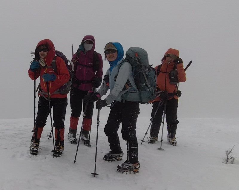 予定よりかなり遅れているので集合写真を撮って早々に下山に掛かります。雪で隠れ掛けたステップを慎重に下り、雪が小止みになり風も収まった所で簡単に昼食にします。疲れた体にジャンクションピークへの登り返しは堪えますが、午後4時前ですが此処迄戻れば一安心です。天気が再び悪化し吹雪の中、殆ど埋まってしまったトレースを探しながら下山します。日没直前の薄暗くなった中無事に駐車場に戻って来ました。お疲れ様でした。